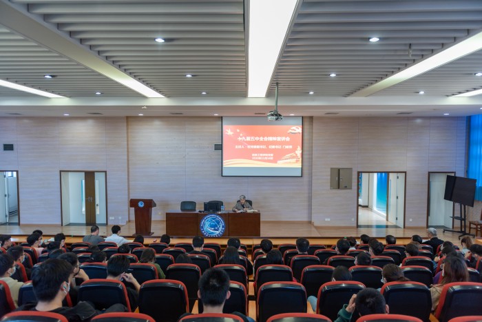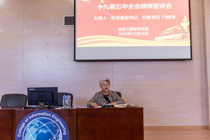 11月18日下午,校党委副书记、纪委书记门妍萍到信息工程学院,与党员、师生深入交流,宣讲党的十九届五中全会精神。学院党政班子成员、教师代表、学生党员、学生干部等150多人参加宣讲会。