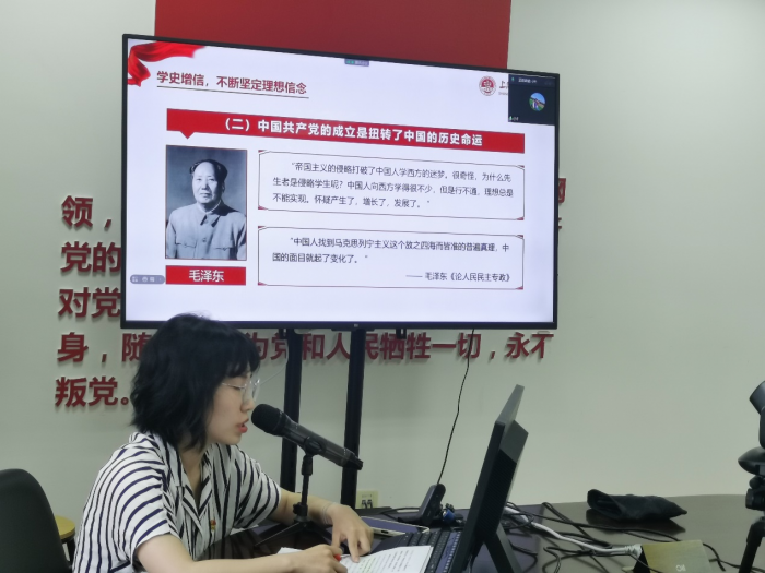 刘老师以党史和海大校史相结合的方式讲解党课。刘老师讲到:学史明理,要通过不断提升理论思维能力,运用党的创新理论武装头脑、指导实践、推动工作、引领发展;学史增信,要通过学习中国特色社会主义道路不断坚定理想信念,坚定对马克思主义的信仰,对社会主义、共产主义的信念,对实现中华民族伟大复兴中国梦的信心;学史崇德,要不断提升道德修养水平,努力做校训“忠信笃敬”的忠实践行者,使自己德智体美劳全面发展,做“五育”并举的时代新人;学史力行,要立志做航运强国的建设者接班人,从党史中汲取奋进的力量,坚定理想信念,学习担当作为,学习报国之志。