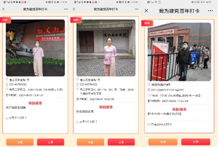 在自由行打卡活动中,支部党员前往市内不同的红色场馆,参观学习,缅怀革命先烈,追溯革命历史。参观地点包括上海农垦博物馆、淞沪战役主题展、陈化成纪念馆、中共一大会址纪念馆、上海市历史博物馆、上海博物馆、上海大剧院等红色基地。