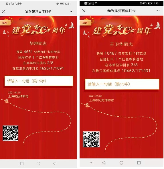 为庆祝建党百年,推进党史学习教育取得实效,信息工程学院网络工程党支部党员参加了由中共上海市教育卫生工作委员会主办的“我为建党百年打卡”活动。