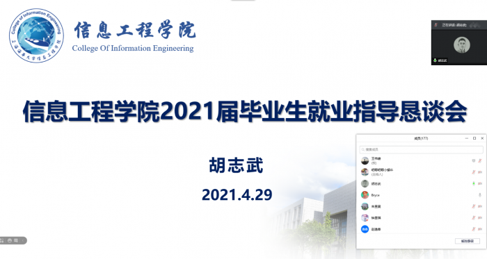 4月29日晚,信息工程学院在腾讯会议召开2021届毕业生就业指导恳谈会,学院党委书记胡志武教授与毕业生推心置腹,进行就业指导,党委副书记孙冬、毕业班辅导员及2021届全体毕业生参加会议。