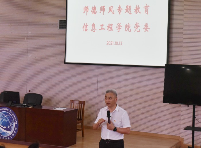 10月13日下午,信息工程学院党委在院报告厅召开师德师风专题教育大会,学院党委书记胡志武主持,全体教职工参加。