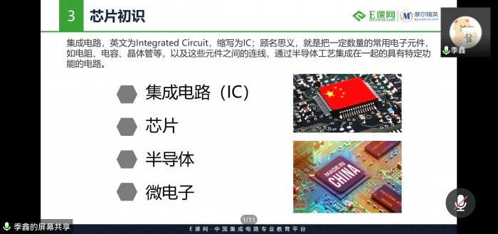 11月3日,信息工程学院邀请摩尔精英集成电路产业发展有限公司的高级项目经理季鑫开展主题为“一节课了解大潮流下的中国集成电路行业” 的线上讲座,帮助学生了解当前全球集成电路产业形势和我国集成电路发展状况,。
