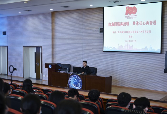 校党史学习教育宣讲团栾扬同学结合学校的特色,围绕主题“向海图强再扬帆,共沐初心再奋进”,介绍了国家海洋战略的形成与演进、中国高等航海教育的新高度、海事的定义与海洋的差异、航海的影响与海员职业现状、新时代中国水上玫瑰女海员,鼓励党员们发掘校史,关注航运,关心海事,坚定支持我国建立海洋强国,维护国家海洋主权。