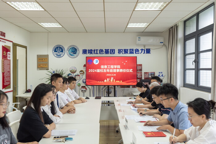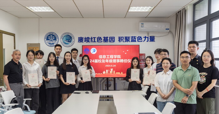 6月20日上午,信息工程学院举办校友会年级(2024届)理事聘任仪式。学院院长、校友会会长周日贵,院党委书记胡志武,院团委书记刘旻,毕业班辅导员及获聘校友会年级理事参加。