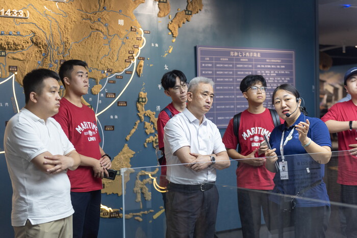 在庆祝第20个中国航海日的热烈氛围中,7月11日,信息工程学院党委书记胡志武带领“涌潮”实践队师生开展“千企百港调查”大学生社会实践活动,旨在深化学生对航海历史文化的理解与认同,同时加强对航运科技发展的认知与探索。此次活动以追寻郑和七下西洋的壮阔起锚地为起点,走进了中国高等航海教育和上海海事大学创始人唐文治先生的故乡——太仓。