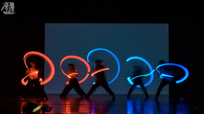 本场晚会分为“启程”“无惧”“历练”“逢源”四个篇章,环环相扣,展现新时代青年大学生追逐梦想的奋斗路程。晚会节目形式丰富多彩,以学生为中心,提供多元化、全方位的美育实践舞台。首先,海之天籁吉他社以两首歌曲迅速点燃了现场的氛围,为整场晚会奠定了积极向上、充满活力的基调。其他社团也展示了独具魅力的节目,为观众带来阵阵新鲜感。MIX配音社通过《零一》的演绎,以荧光棒的舞动勾勒出了一道道璀璨的希望之光;韩社舞蹈《perfect night》为晚会注入活力,让现场变得热闹非凡;魔术社的《拍钉》极具神秘色彩,神奇瞬间让观众惊叹不已。