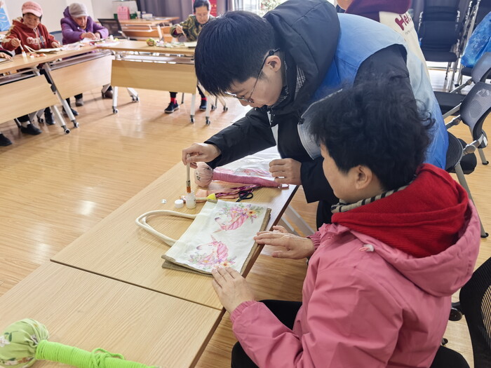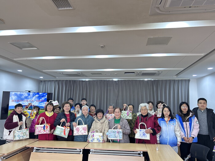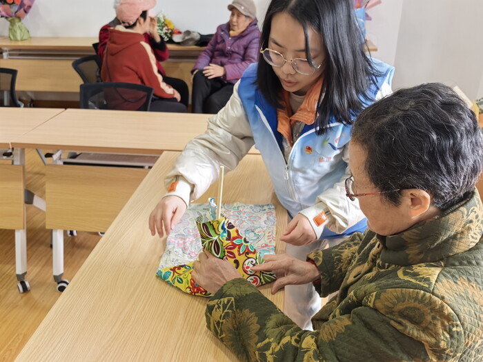随后开展的蝶古巴特包创作进一步激发老年人兴趣。志愿者们帮助老人进行了“剪裁-拼贴-刷胶-晾干”的完整工序。老人们发挥艺术想象力,将布料转化为独一无二的手提包作品。活动现场欢声笑语不断,青年志愿者与老人默契配合,搭建起了跨代际沟通的桥梁。