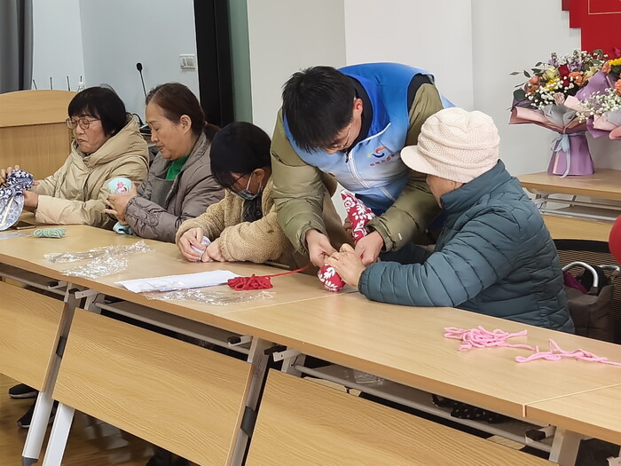 活动伊始,志愿者通过向老人介绍了艾草锤的制作过程,在手工制作环节,志愿者们化身“小老师”,耐心指导老人将木棍插入艾草包中,并用布匹将艾草锤包住,用麻绳缠绕固定成锤形。艾草清香弥漫间,老人们不仅完成了养生锤的制作,更在捶打肩颈的体验中感受到传统中医文化的魅力。