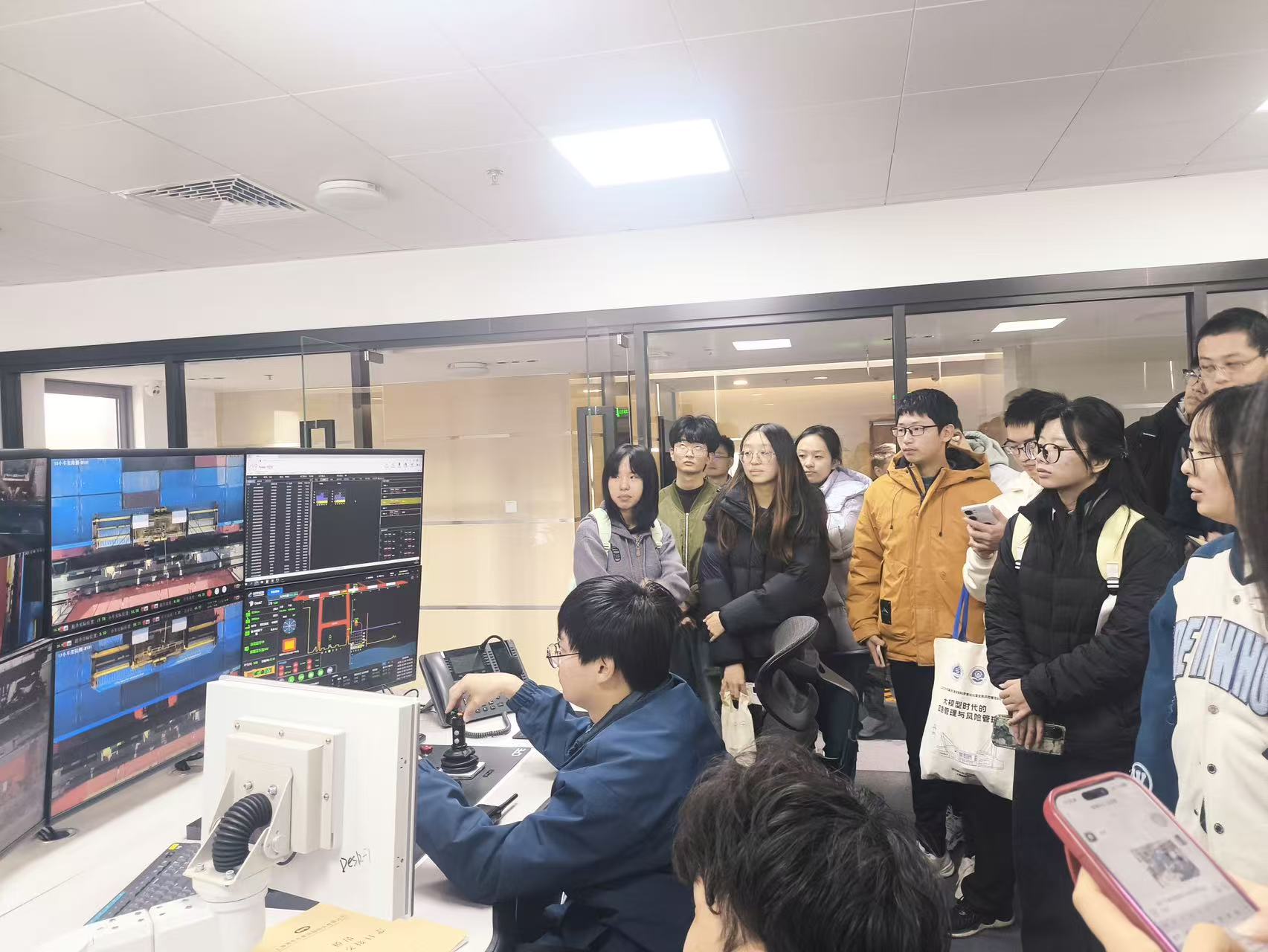 活动伊始,师生一行乘车深入码头作业核心区域,实地观摩智慧港口运作全景。在港口中控室,技术人员现场演示了一体化智能系统对集装箱装卸、堆存等关键流程的远程操控,让师生直观领略了码头“无人化、自动化”的作业模式。在后续座谈会上,上海交通建设工程管理中心、上港集团工程指挥部、罗泾港项目相关负责人围绕自动化码头系统架构、核心技术突破、网络安全防护体系及绿色能源应用等内容作深度分享,师生们结合专业知识,就码头自动化相关议题展开了热烈研讨。