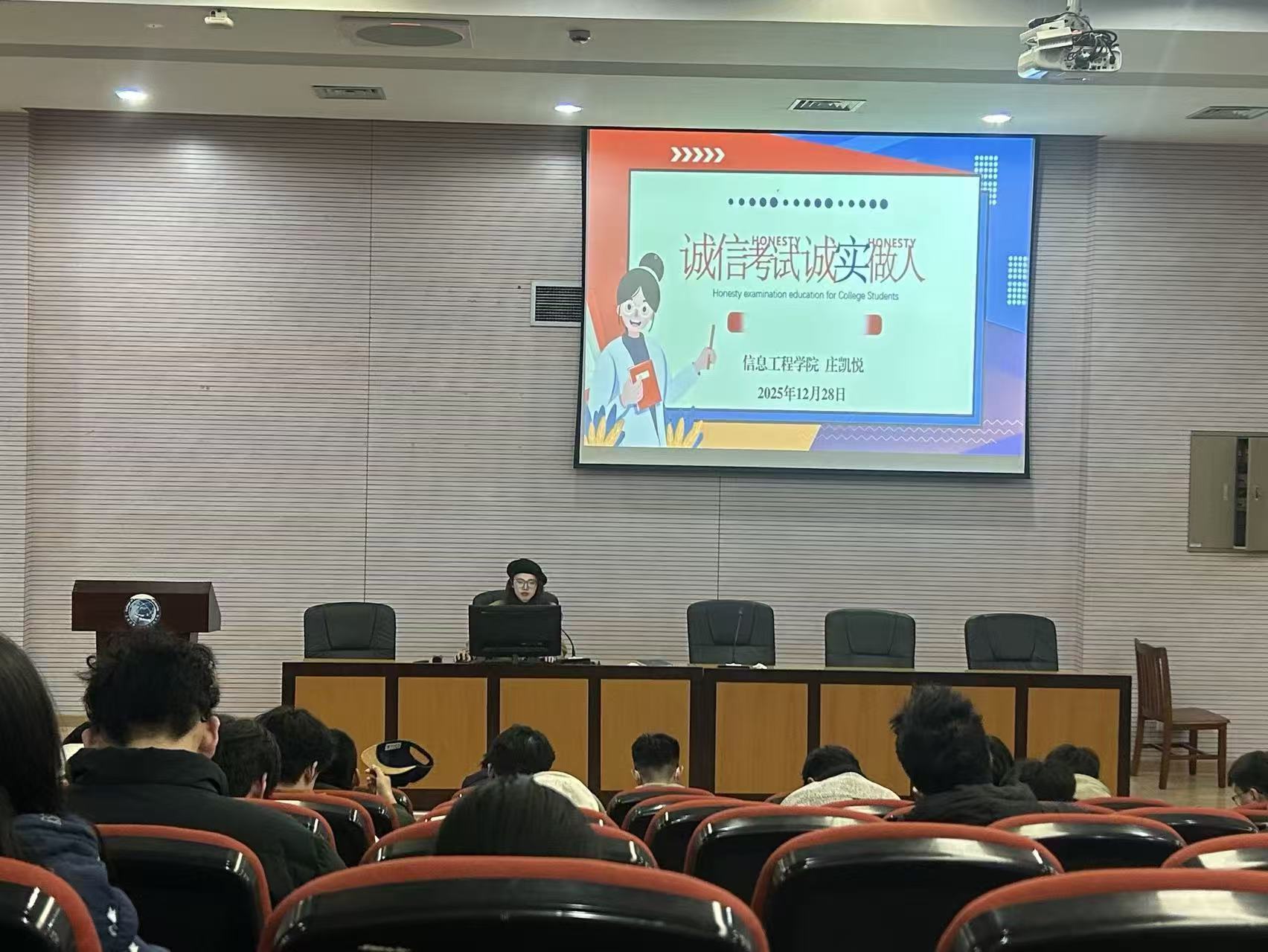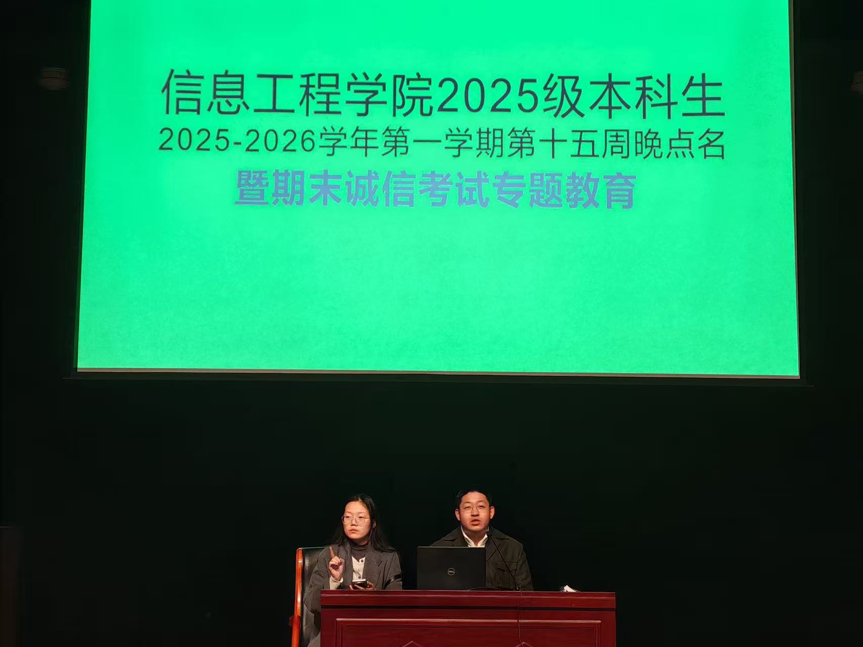 为严肃考风考纪、端正学习态度、规范学习行为,切实增强全体本科生的诚信考试意识,营造公平公正的考试环境,12月28日,信息工程学院面向全体本科生开展诚信考试教育主题晚点名活动。