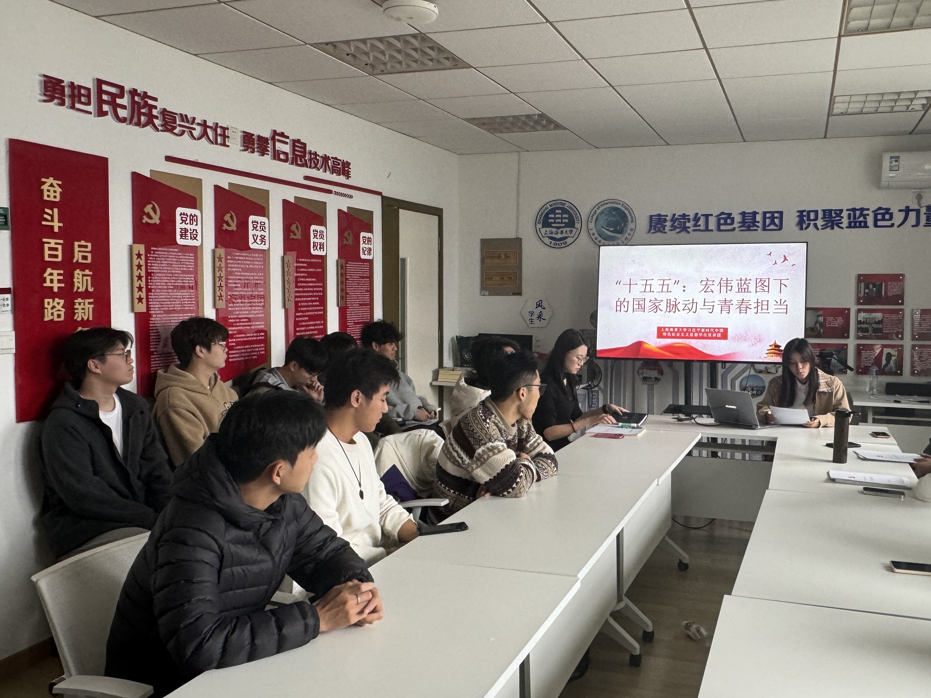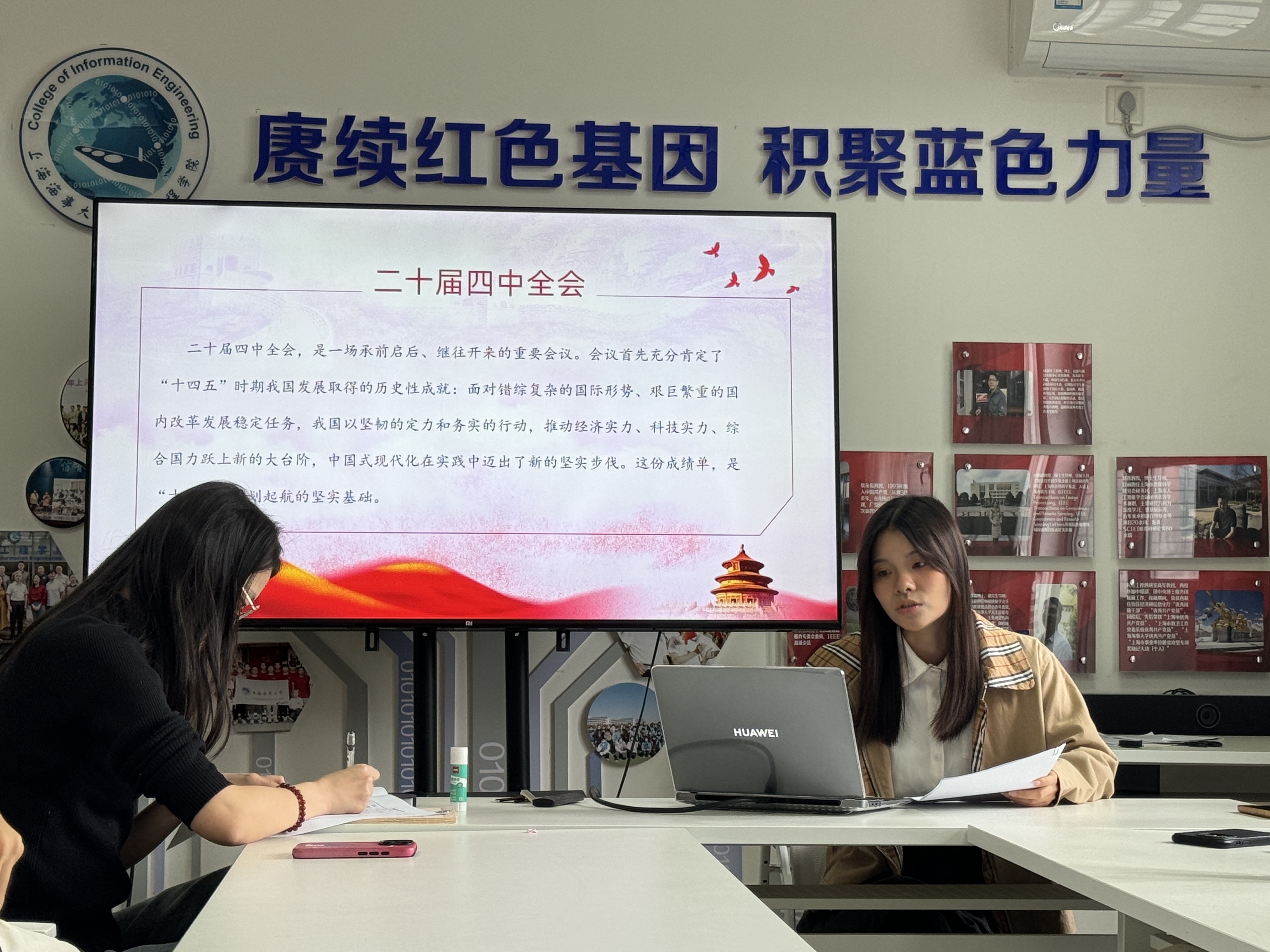 2025年12月10日,信息工程学院2023级计算机系学生党支部召开专题宣讲会,深入学习贯彻党的二十届四中全会精神,解读“十五五”规划建议。会议由党支部书记王盛楠老师主持,习研会宣讲部部长王涟仪担任主讲。