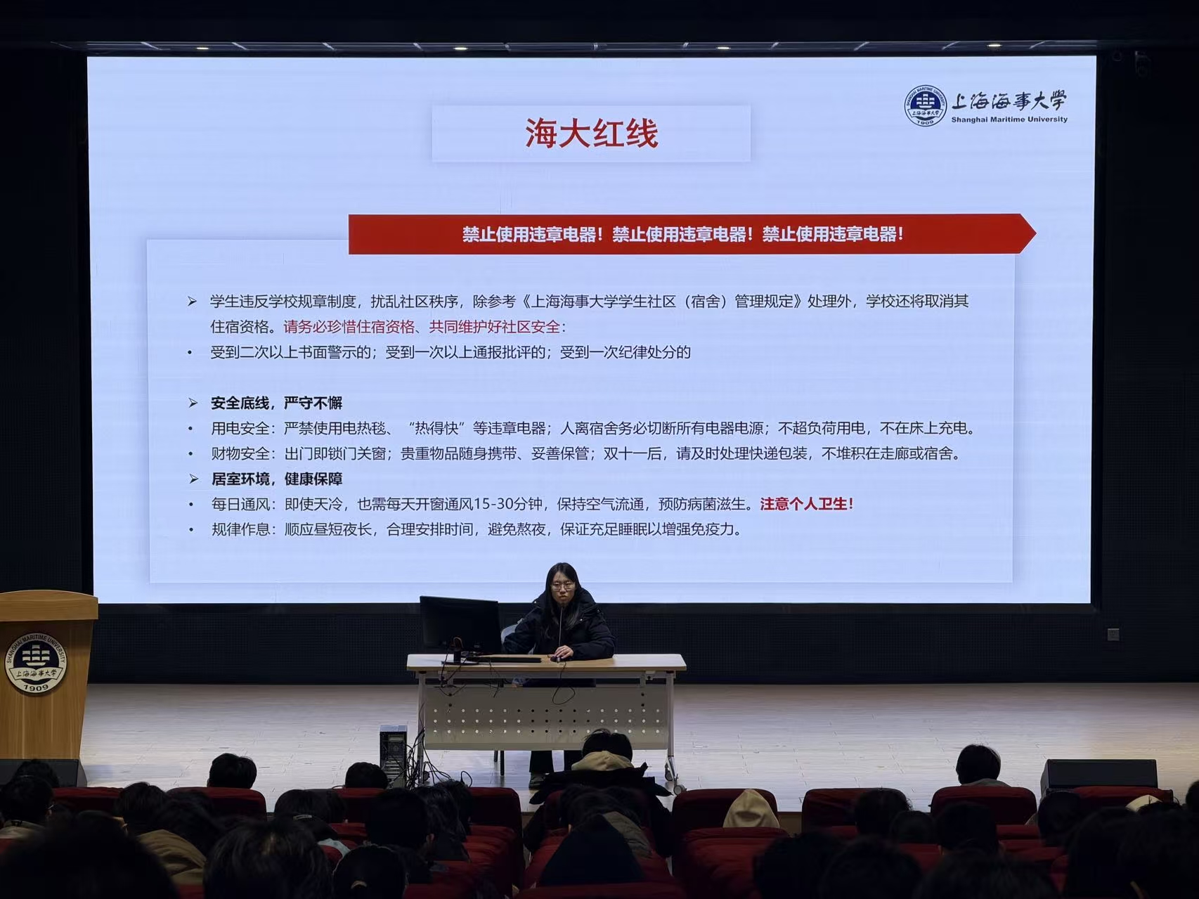 会上,王老师首先聚焦宿舍安全,向同学们重申校园安全管理规定。她强调,宿舍内严禁吸烟,对于因违规吸烟引发火灾等安全事故的行为,将依法依规严肃处理。同时,她指出宿舍是集体生活空间,每位同学都应自觉规范自身行为,共同维护整洁有序的住宿环境;针对秋冬季节病毒易传播的特点,提醒大家定期开窗通风、做好卫生消毒,筑牢健康安全屏障。