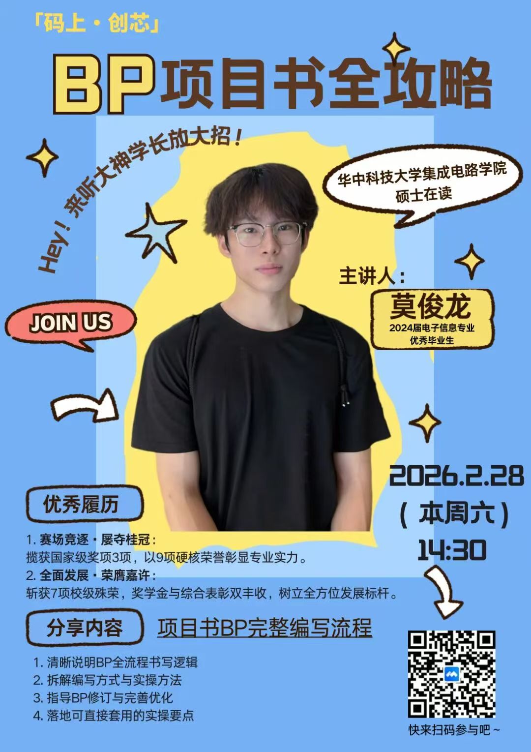 第二期讲座于2月28日举行,邀请2024届电子系优秀毕业生莫俊龙主讲。莫俊龙曾获第十届“挑战杯”中国大学生创业计划竞赛全国铜奖,他以获奖项目书为案例,从商业计划书的结构逻辑、核心亮点凝练、常见误区规避等方面,逐项拆解了一份高分项目书的撰写要点,并分享了答辩环节的实战经验。