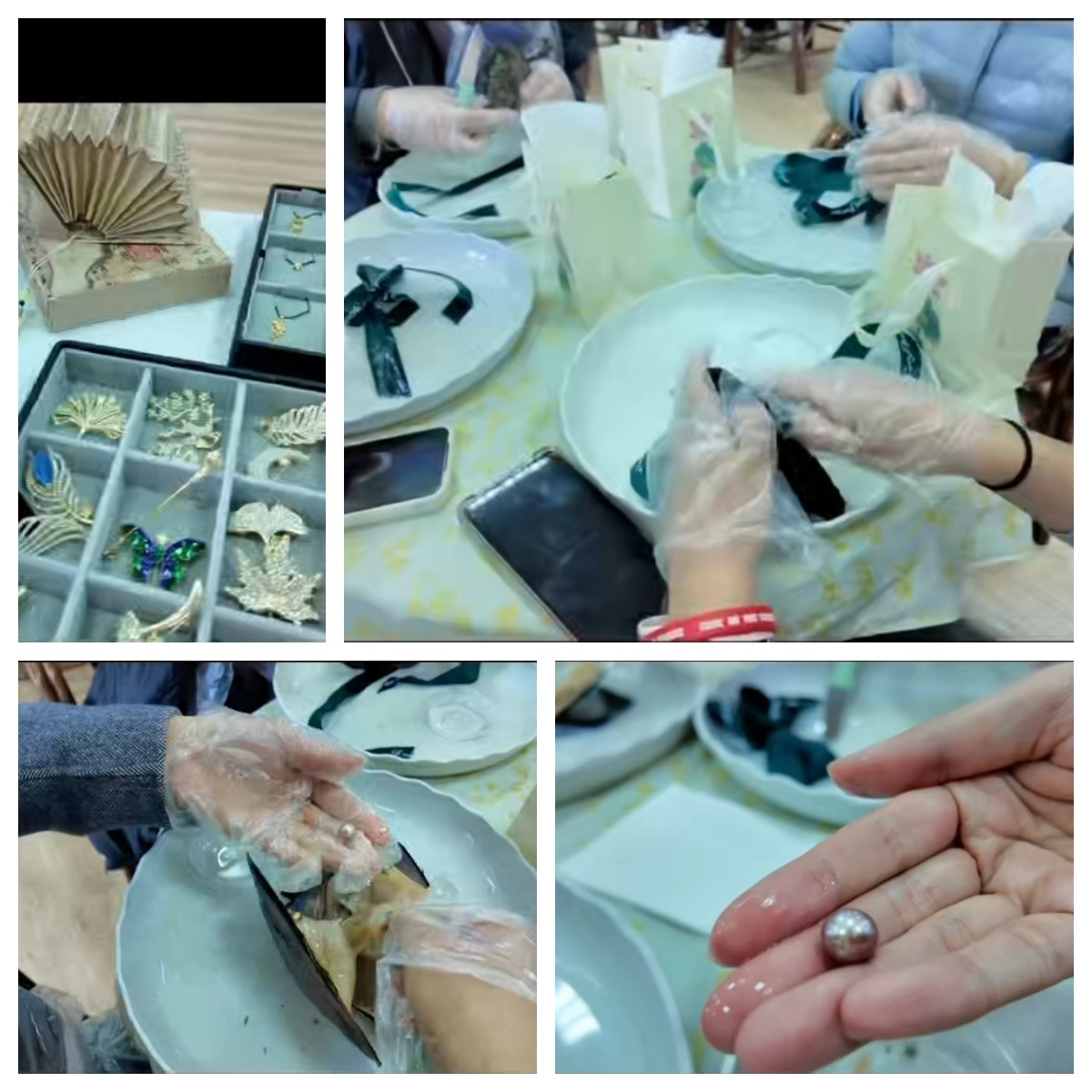 取珠只是第一步,接下来的清洗、打磨、打孔、镶嵌更见巧思。在老师的指导下,大家小心翼翼地清洗掉珍珠表面的薄膜,轻轻打磨使其更加温润光滑。随后,大家根据自己的喜好挑选戒托、胸针或项链底座,将亲手开出的珍珠镶嵌其中。